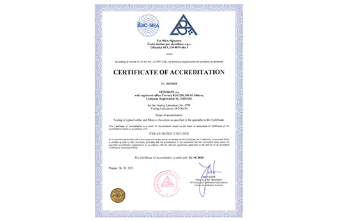 The OPTOKON Testing Division provides comprehensive testing services for optical cables and electronic equipment under electromagnetic, climatic, and mechanical conditions. Operating in accordance with ČSN EN ISO/IEC 17025, the division is equipped with modern facilities including an EMC chamber and climatic test systems, ensuring precise evaluation of performance, durability, and compliance.