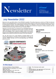 Welcome to the July 2022 edition of the OPTOKON newsletter. This edition features an article by Jiří Štefl, the General Director of the OPTOKON Group, on how the Group is planning for Industry 4.0 (the fourth industrial revolution) in terms of its cyber-physical transition. The implementation of Industry 4.0 is reflected in many of the articles in this edition, which include Stablenet software training at OPTOKON, the Signal Corp Conference focused on military solutions and the INFODAS workshop focusing on Secure Domain Transition (SDoT).