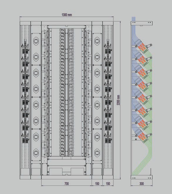 - Integrated patchcord management to adjacent racks avoids the usage of external ducts