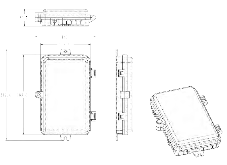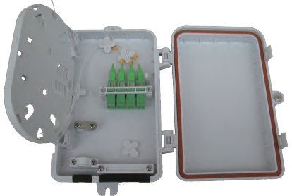 The MOTB-X04 small distribution box is designed to be used in distribution nodes of FTTH network, floor cabinet for example. It allows termination of optical cable by splicing of pigtails, including connection passive optical splitters 1:4 into passive fiber optic infrastructure. The ruggedized box is designed for both indoor and outdoor applications.