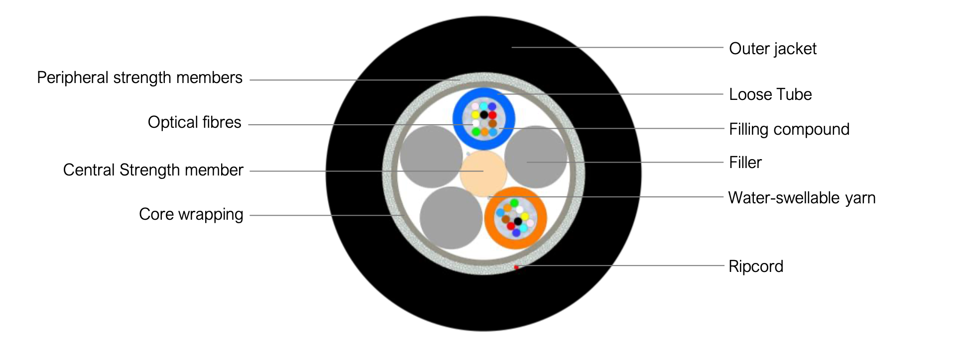 Indoor/Outdoor fiber optic cable with enhanced rodent protection—suitable for installation in ducts or on cable grids.