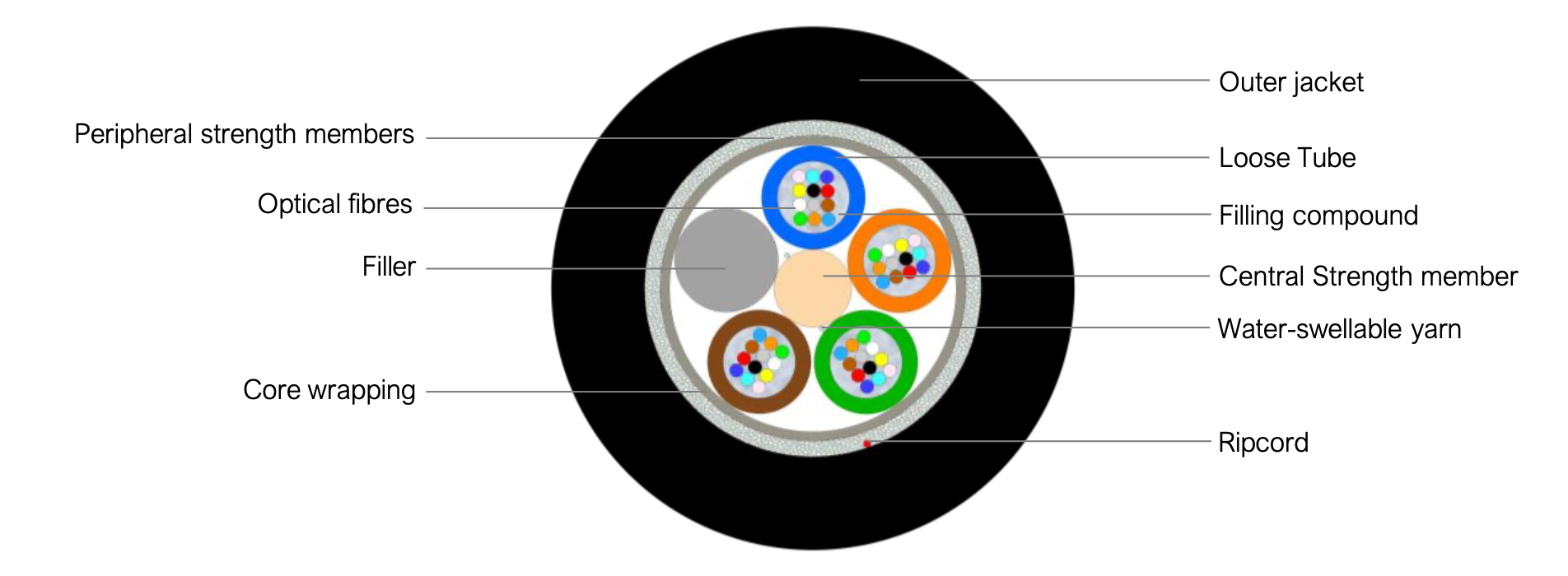 Indoor/Outdoor fiber optic cable with enhanced rodent protection—suitable for installation in ducts or on cable grids.