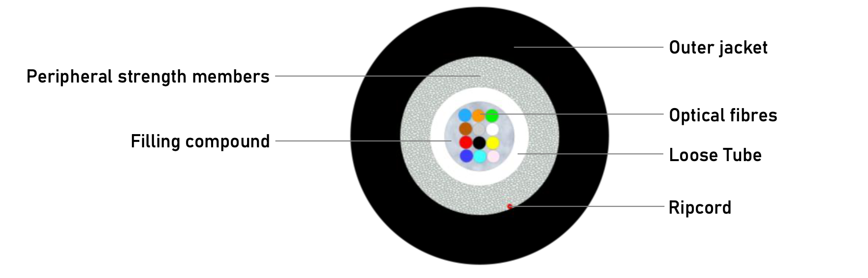 Indoor/Outdoor fiber cable for tidy installation in ducts or on overhead grids.