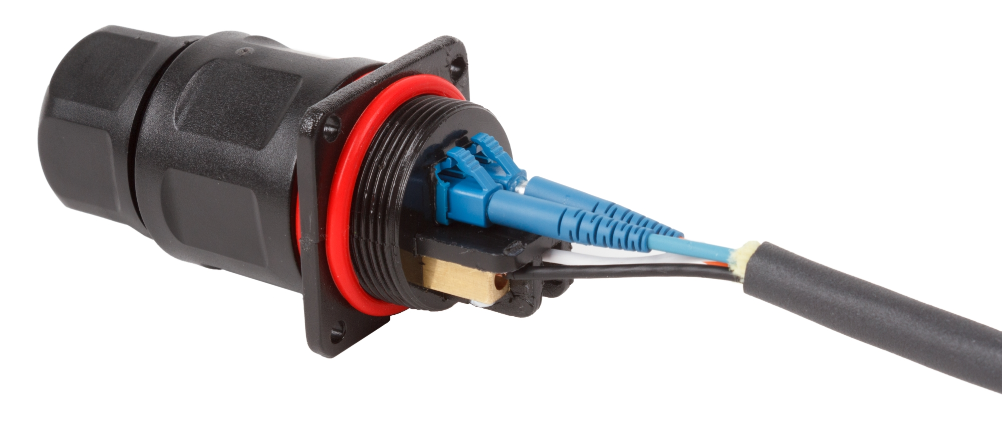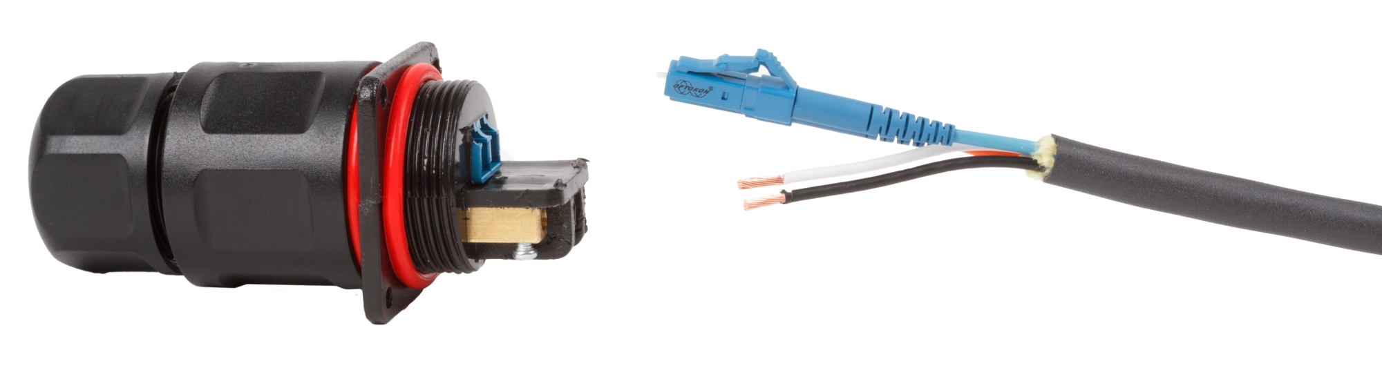 The OPTOKON OPHC-xx series connector-adapter introduces hybrid rugged design fiber optic – copper wires connector. The OPHC includes the LC duplex adapter and electrical contacts in rugged housing, which allows interconnection of hybrid cables: two optical fibers terminated with LC connectors and up to three copper wires.