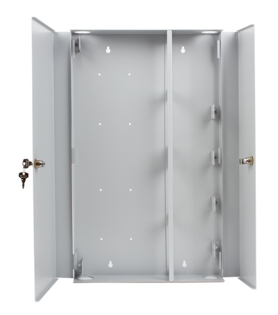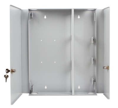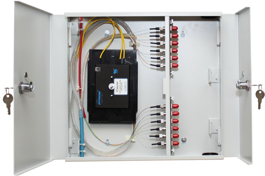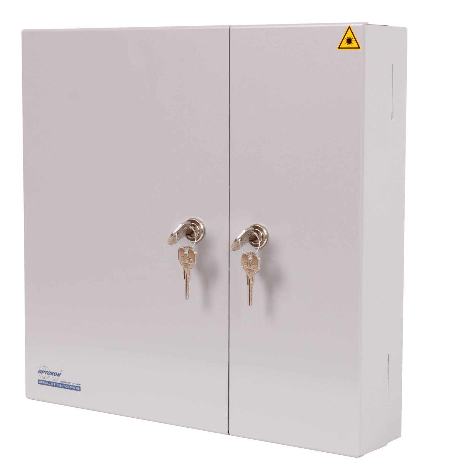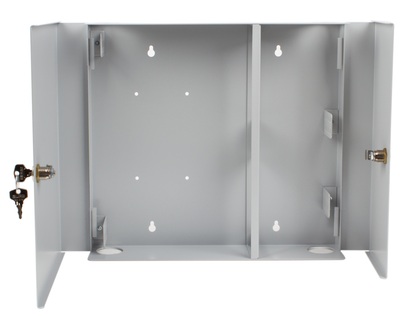 The double-door Wall mount Interconnect Cabinet (MPIC) is available from 6 to 144 (192) fiber capacities. The cabinet is ideal in building entrance terminals, telecommunications closets, computer rooms and other controlled environments where space is limited. This double door cabinet provides segregated access for the end-user and the installer. Both doors are fully removable from base, which allows easy access during installation works and optical network reconfiguration. End-users can reconfigure the connections without exposing the installation workspace. The cable strain-relief is facilitated with dual cable tie "brackets".