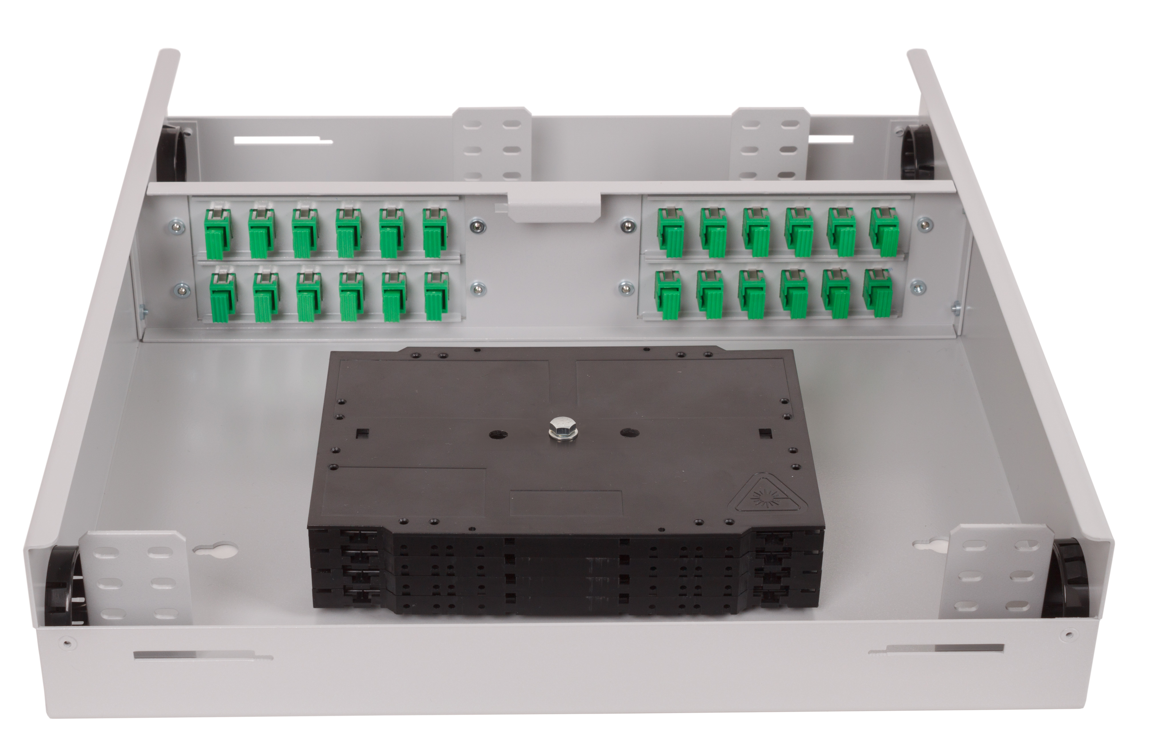 1)  Fiber capacity is valid for standard connector types and depends on connector adaptor type, e.g. in the case DLC it is double capacity and QLC is quadruple capacity. Under the condition that in splice trays then instead of standard protection sleeves there are used smaller and thinner sleeves and there are used 2 lines in one splice holder.