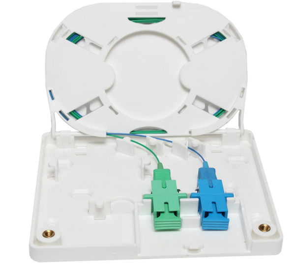 The OPTOKON MCPE-02 box introduces the wall mount, two fibers box, which is designed for optical cable termination in the customer premises – end user site in FTTH projects. The MCPE-02 box includes the holder for two splice protection sleeves. The internal fiber guides ensure the arrangement of the fiber reserve and its protection against smaller bending radius than allowed.