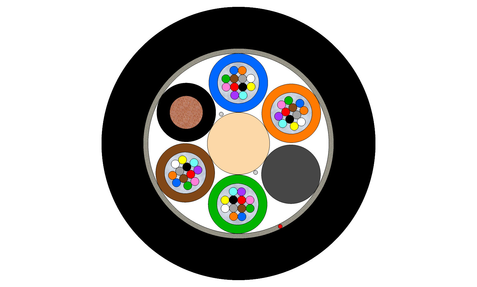 Multitube fibre optic cable for external installation with insulated copper conductor for easy detection of the cable from the surface of the ground above the cable.