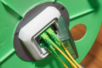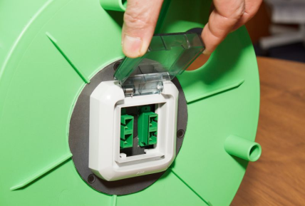 The internal end of the cable is terminated with 4 x SC/APC connectors connected with adapters. Two duplex SC adapters are installed in a protected box on the drum body and can be accessed after opening the cover. Once closed, there is IP 54 environmental protection that enables storage and handling of the drum in outdoor conditions.