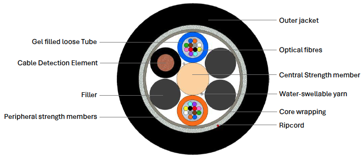 Multitube fibre optic cable for external installation with insulated copper conductor for easy detection of the cable from the surface of the ground above the cable.